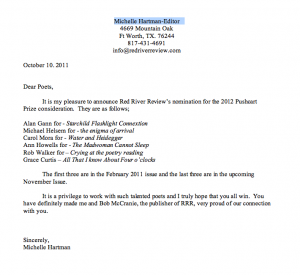 It’s a nice letter for any poet to receive. My poem Crying at the poetry reading (to appear in Red River Review in November) has been nominated by editor Michelle Hartman for the Pushcart Prize. This prize is a pretty big deal in the States & I’m not sure how many Australians have been nominated previously (novelists M J Hyland & Nam Le spring to mind but the only poet I know of is Alison Croggin.) Of course it’s only a nomination, but it would be gratifying to be in the book, not to mention the excellent company. Thanks to Red River Review for nominating me.